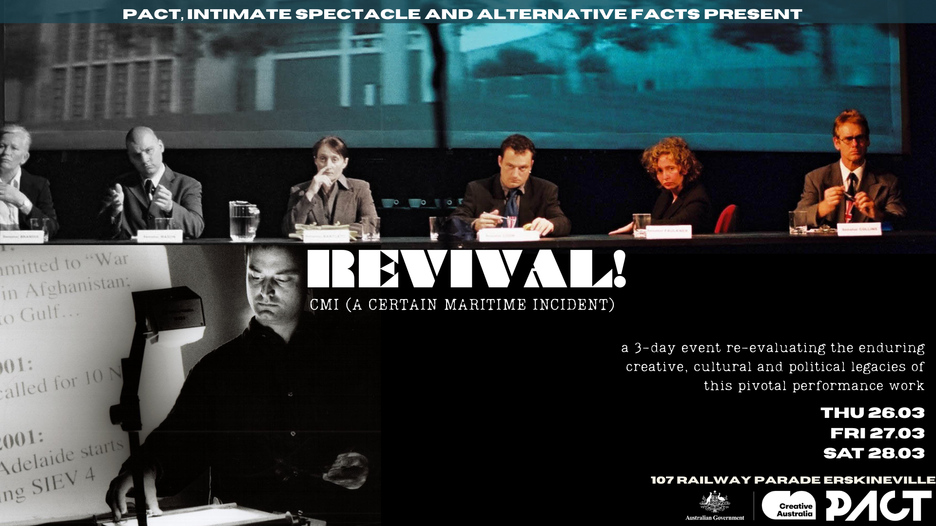 Revival! CMI (A Certain Maritime Incident) is a three-day public program of performances, talks, screenings and discussions that take as their starting point the celebrated 2004 performance work CMI (A Certain Maritime Incident) by version 1.0.